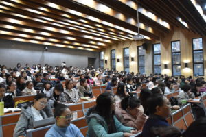 随后,廖鸿婧又从教师的视角对各门课程概况、特别是教学大纲等方面做了详实说明,并向学生介绍了米乐官网双学位/双专业的报名程序、选课流程、收费标准和注意事项。之后,仵胜奇对双学位课程的运行机制和各课程考核要求做了进一步说明,鼓励同学们在学好主修专业的基础上,需要根据自己的学习兴趣和规划积极报名修读英语双学位/双专业。随后,匡琳琳、庄双和窦茹苑就学生提出的双学位/双专业课程的具体网上选课时间、学分计算、跨院系、年级选课要求等学生普遍关心的实际问题进行了现场解答。整场宣讲会期间,能容纳260人的大教室座无虚席,现场气氛轻松而热烈。宣讲会最后在师生们热烈的掌声中顺利结束。